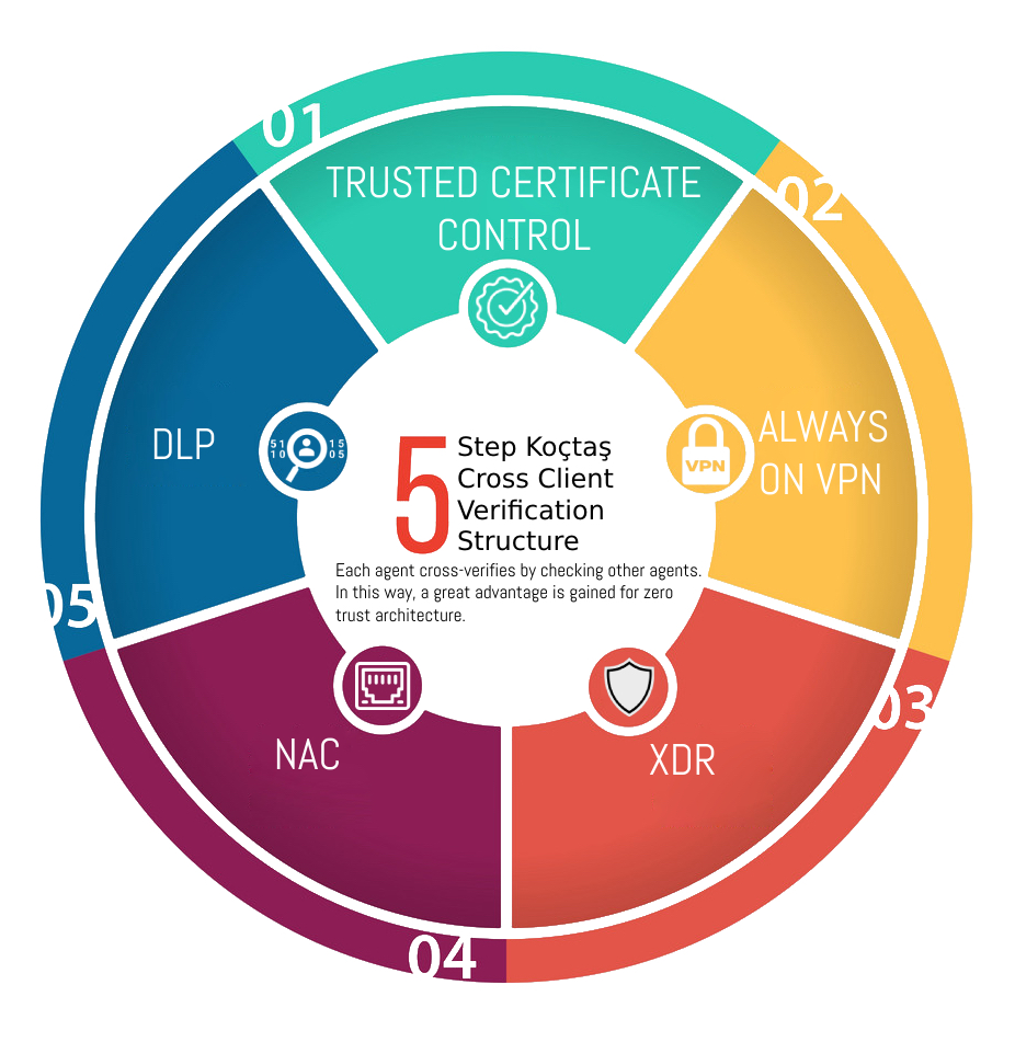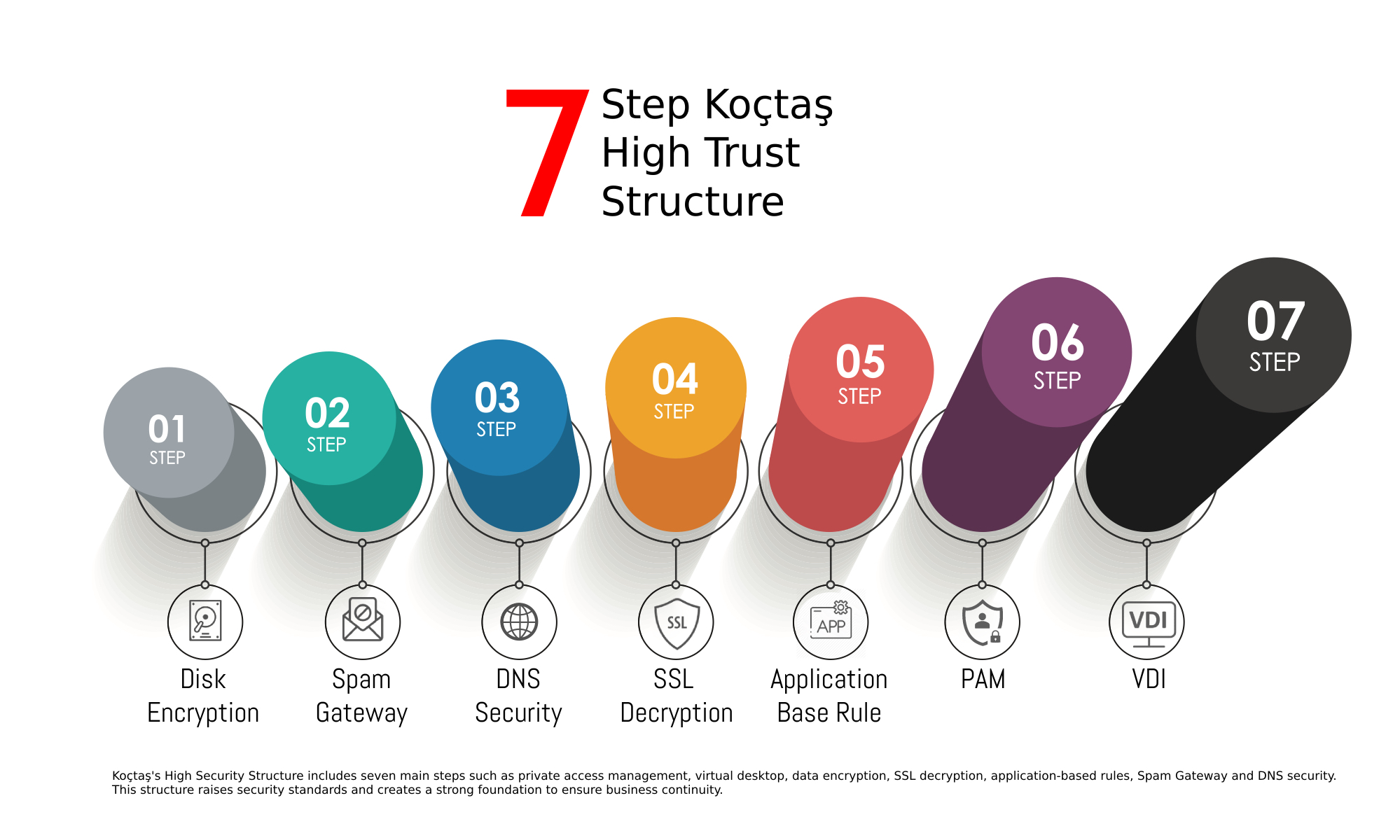 "Koçtaş'ın büyüyen yapısında siber güvenlik ihtiyaçlarını tam olarak karşılayabilmek için Zero Trust mimari dönüşümünü tamamlamayı hedefledik. Kendimiz 3 farklı yapının birleşmesinden oluşan Koçtaş Zero Trust+ mimarisini benimsedik ve aşağıdaki uygulamaları hayata geçirdik; 5 adımlı Koçtaş Cross Client Verification yapısının uygulanması, Always ON VPN (SASE) – Cloud bazlı %100 network monitör ile kullanıcılar her zaman güvende, Advanced Network Access Controller (NAC) – Ağımızın fiziksel girişleri güvende, XDR (Extended Detection and Response) – İşletim sistemi ve ağ katmanı davranışsal olarak güvende, Data Loss Prevention (DLP) – Veri kaybına karşı güçlüyüz, Trusted Certificate Control – İşletim sistemi olan cihazları doğruluyoruz, 5 adımlı Koçtaş Cyber Incident Tracking yapısının uygulanması, Vulnerability Scanning Tools – Otonom zafiyet tarama ve doğrulama sistemi, Security Validation Platform – Mevcut yapımızın ataklara karşı güvenliğini kontrol ediyoruz, RED & BLUE TEAM Service – Kırmızı ve mavi takımlarımız ile güvenliğimizi operasyonel olarak doğruluyoruz, SOC (Security Operation Center) – Kritik olarak belirlediğimiz olayları 24 saat izliyor ve aksiyon alıyoruz, Intelligence Service – İstihbarat servisi ile dış dünyada oluşan olayları takip ediyor önlem alıyoruz, 7 adımlı Koçtaş High Trust yapısının uygulanması, Disk Encryption – Son kullanıcı cihazlarımızın diskleri içindeki verileri koruyoruz, Spam Gateway & ATP – Yapay zekâ ve Sandbox desteği ile zararlı maillerden korunuyoruz, DNS Security – Kullanıcının internete doğru ilk isteğinden itibaren güvenlik sağlıyoruz, SSL Decryption – Şifrelenmiş trafiğin içerisinden geçebilecek zararlıları tespit edip önlüyoruz, Application Base Rule – Yeni nesil firewall yeteneklerine uygun olarak uygulama bazlı kurallar yazıyoruz, PAM – Yetkili hesap yönetimini iki faktör doğrulama ile güvenli bir şekilde yapıyoruz, VDI – Yetkili kullanıcılarımızın erişimlerini sanal masaüstü alt yapısı üzerinden güvenli ve kontrollü bir şekilde yapıyoruz,"