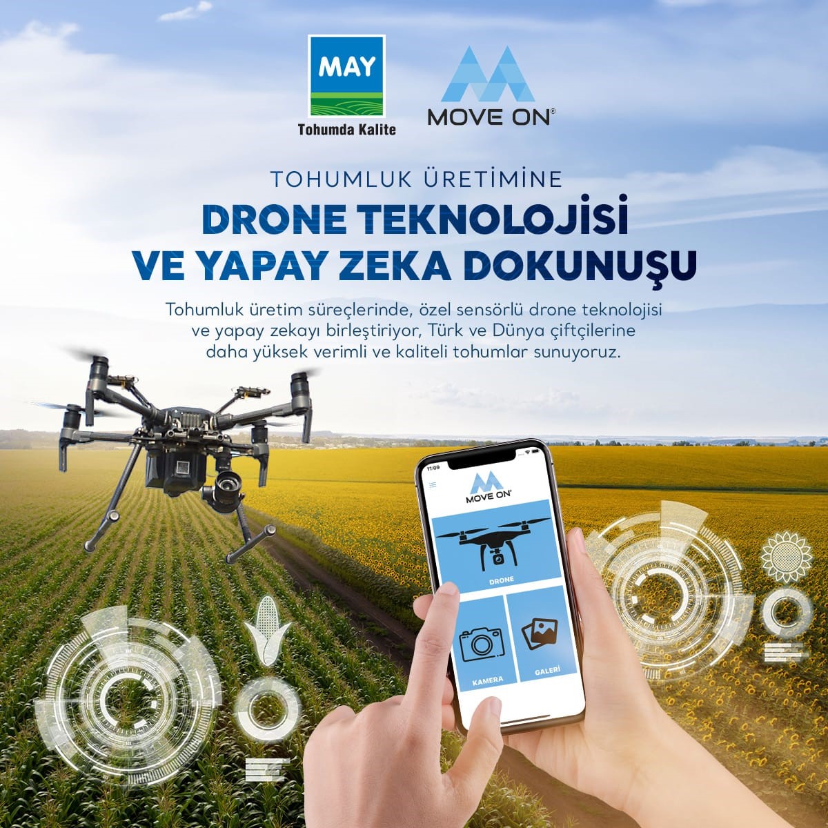 Drone teknolojilerinin tarımda kullanımında Türkiye’nin önde gelen firmalarından olan May Tohum, hedefleri ve vizyonu doğrultusunda yerli ve yabancı iş ortaklarıyla Dünya’da sürekli gelişmekte olan tarım teknolojisini yakından takip etmektedir. Akıllı dümenleme sistemleri, akıllı ekim mibzerleri, tarımsal drone teknolojilerini, ilaçlama dronları, yüksek teknolojili ilaçlama ve hasat makinaları ile Tarım 4.0 için ön hazırlıklarını tamamlamak üzere olan May Tohum, yapay zekâ ve derin öğrenme teknolojilerini bünyesine katmak için uğraş vermektedir. İnsan kaynaklı hataları minimum seviyeye indirgerken, yapay zekâ ve derin öğrenme teknolojileri ile daha hassas veri akışı elde edilmeye başlanmıştır. Veri akışının süreçlere entegre edilmesi ile saha çalışanlarının verimlilikleri 80’lere varan oranda artış gösterirken, ürün girdi maliyetlerinin de %20 oranında düşmesini sağlamıştır.